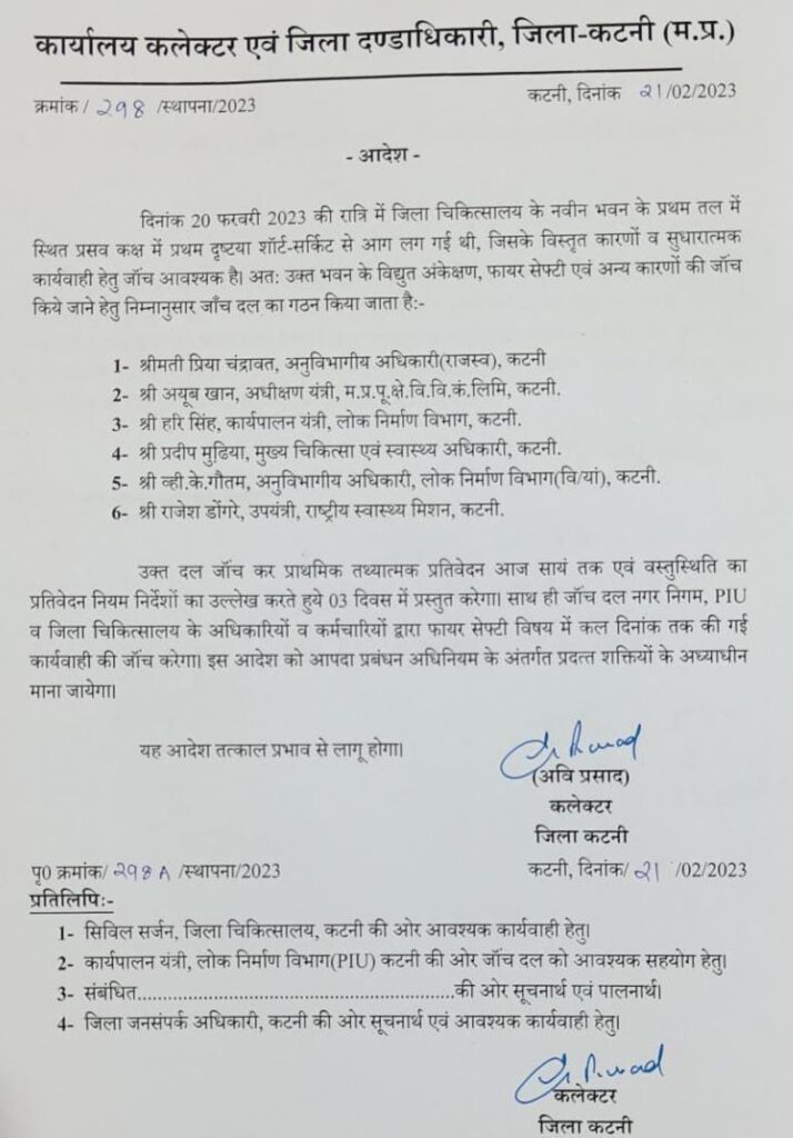 कटनी (21 फरवरी) – जिला चिकित्सालय के नवीन भवन के प्रथम तल स्थित प्रसव कक्ष में बीते सोमवार की रात आग लगनें के कारणों की जांच हेतु कलेक्टर अवि प्रसाद ने 6 सदस्यीय जांच दल गठित कर दिया है। यह जांच दल प्राथमिक तथ्यात्मक प्रतिवेदन मंगलवार की शाम तक और वस्तुस्थिति का पूर्ण प्रतिवेदन तीन दिन में प्रस्तुत करेगा।